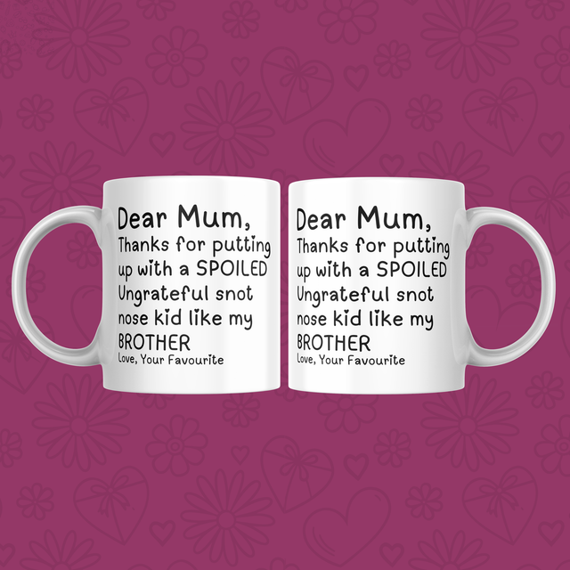 Show your appreciation with this charming "Dear Mum Thanks For Putting Up With My Brother" 11oz mug. Perfect as a heartfelt gift for mum, this durable ceramic mug features a witty and loving message that celebrates her patience and sense of humor. Ideal for daily use, it’s great for enjoying coffee, tea, or any favorite beverage. Its comfortable handle and standard 11oz size make it practical and easy to hold. Whether for Mother’s Day, birthday, or just because, this mug is a meaningful way to brighten her day and remind her how much she’s loved. Dishwasher and microwave safe for convenient everyday use.